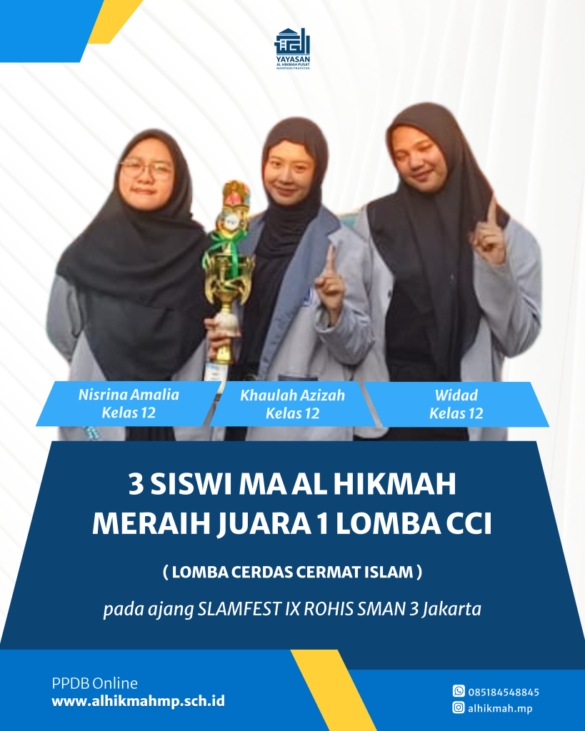 Alhamdullh wa BarakAllah untuk 3 siswi Madrasah Aliyah Al Hikmah yang berprestasi dalam Lomba Cerdas Cermat Islam SLAMFEST IX, yang diselenggarakan oleh SMAN 3 Jakarta! Selamat kepada para pemenang: Nisrina Amalia (Kelas 12), Khaulah Azizah (Kelas 12), dan Widad (Kelas 12) Semoga keberhasilan ini menjadi motivasi untuk terus berlatih, berprestasi, dan menginspirasi. Aamiin!
